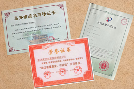 紅旗過(guò)濾全自動(dòng)過(guò)濾機(jī)專利證書和多項(xiàng)榮譽(yù)證書